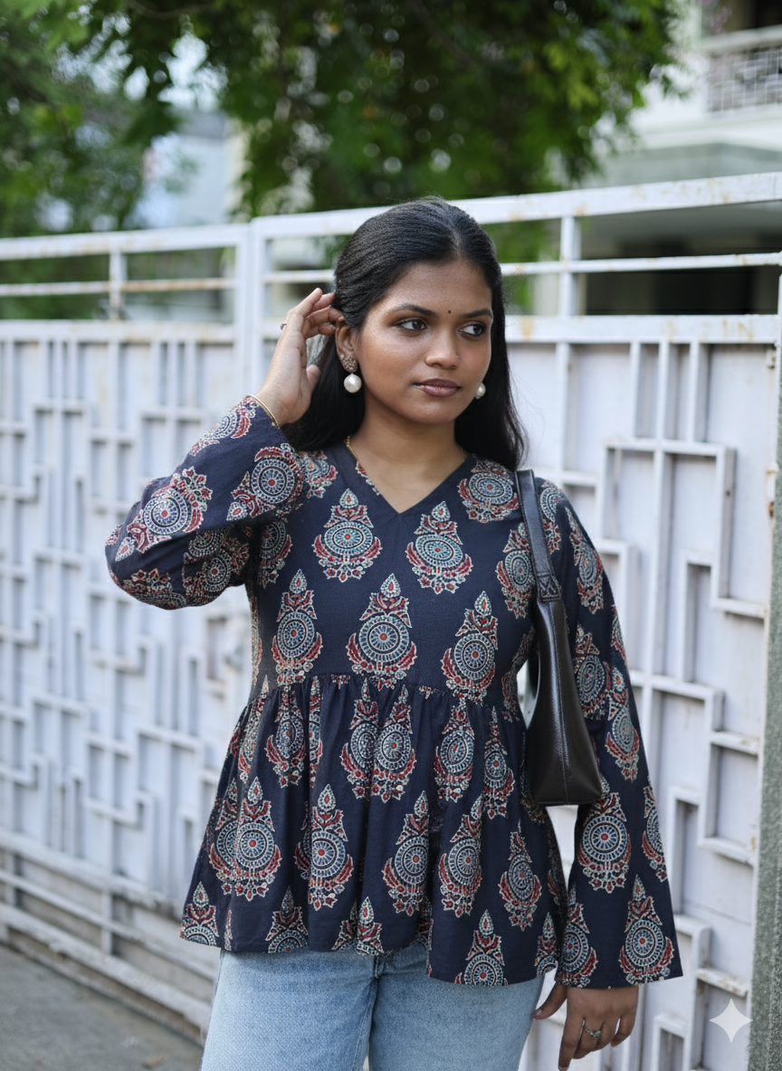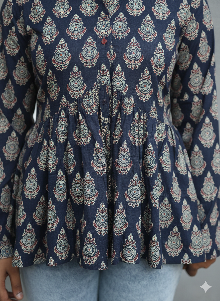Bold, festive, and striking — this Pink beauty is crafted in pure Jaipur cotton. The peplum silhouette with flared sleeves adds a dramatic flair for celebrations that need a statement.